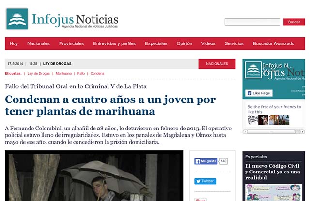 La justicia penal condenó el lunes a Fernando Colombini, un albañil de 28 años, a 4 años de prisión de cumplimiento efectivo por tener plantas de marihuana en el fondo de su casa de Saladillo. Fernando fue detenido el 7 de febrero de 2013, cuando la policía y el fiscal Alberto Espartaco Sarramone le incautaron las plantas en un operativo lleno de irregularidades. Fernando estuvo en los penales de Magdalena y Olmos hasta mayo del mismo año, cuando le concedieron la prisión domiciliaria.