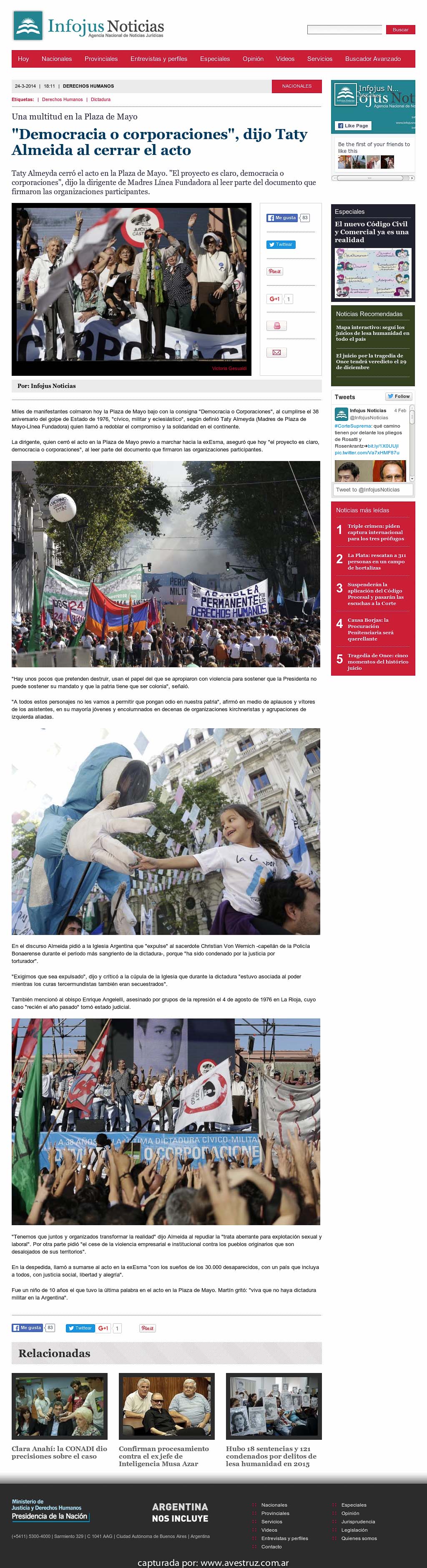 Miles de manifestantes colmaron hoy la Plaza de Mayo bajo con la consigna “Democracia o Corporaciones”, al cumplirse el 38 aniversario del golpe de Estado de 1976, “cívico, militar y eclesiástico”, según definió Taty Almeyda (Madres de Plaza de Mayo-Línea Fundadora) quien llamó a redoblar el compromiso y la solidaridad en el continente.