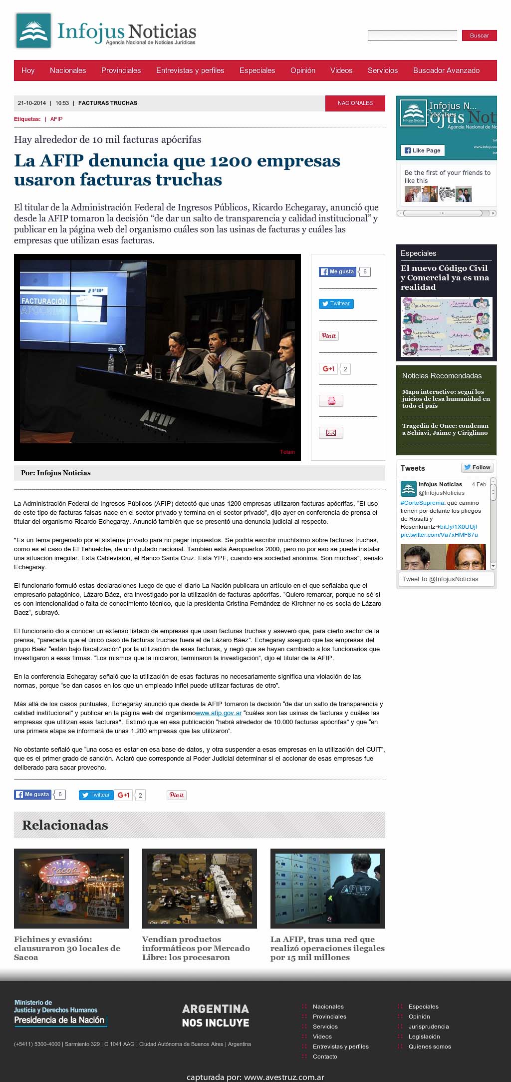 El funcionario dio a conocer un extenso listado de empresas que usan facturas truchas y aseveró que, para cierto sector de la prensa, “parecería que el único caso de facturas truchas fuera el de Lázaro Báez”. Echegaray aseguró que las empresas del grupo Baéz “están bajo fiscalización” por la utilización de esas facturas, y negó que se hayan cambiado a los funcionarios que investigaron a esas firmas. “Los mismos que la iniciaron, terminaron la investigación”, dijo el titular de la AFIP.
