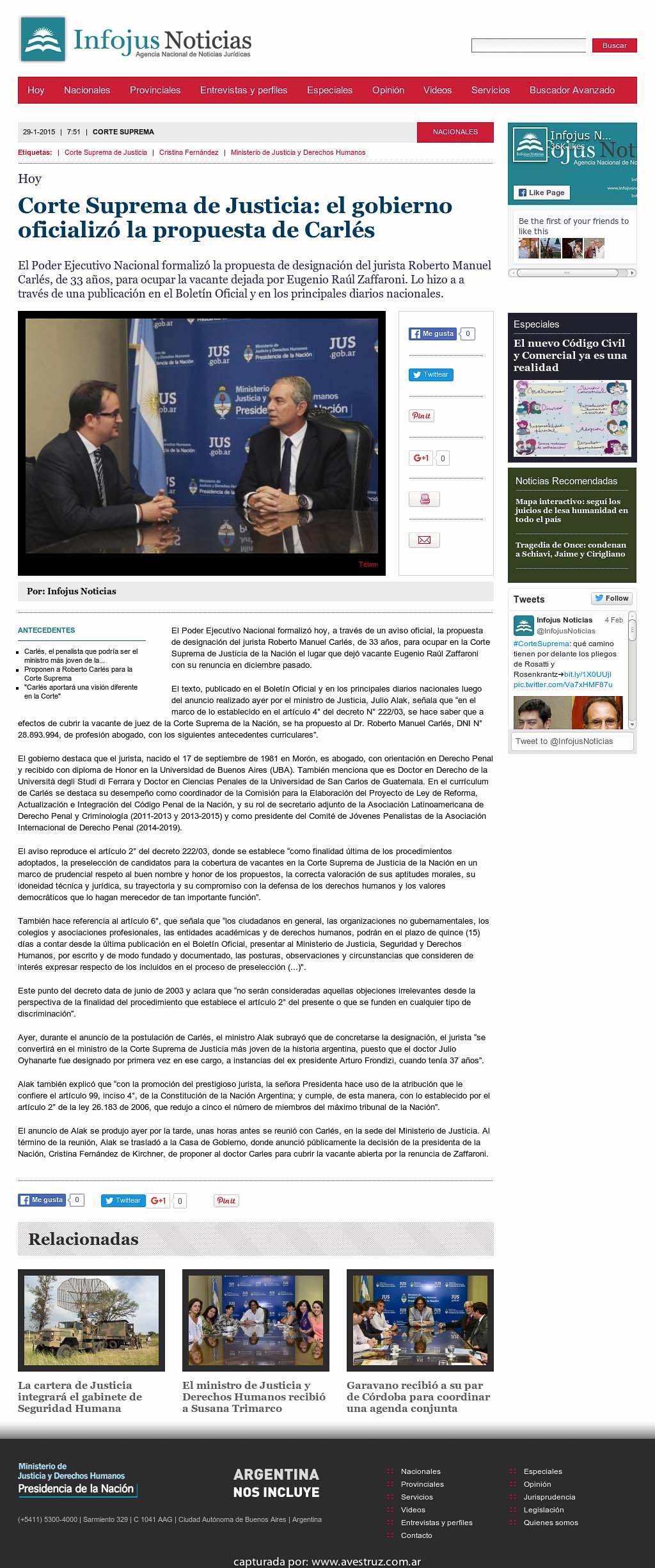 El texto, publicado en el Boletín Oficial y en los principales diarios nacionales luego del anuncio realizado ayer por el ministro de Justicia, Julio Alak, señala que “en el marco de lo establecido en el artículo 4° del decreto N° 222/03, se hace saber que a efectos de cubrir la vacante de juez de la Corte Suprema de la Nación, se ha propuesto al Dr. Roberto Manuel Carlés, DNI N° 28.893.994, de profesión abogado, con los siguientes antecedentes curriculares”.