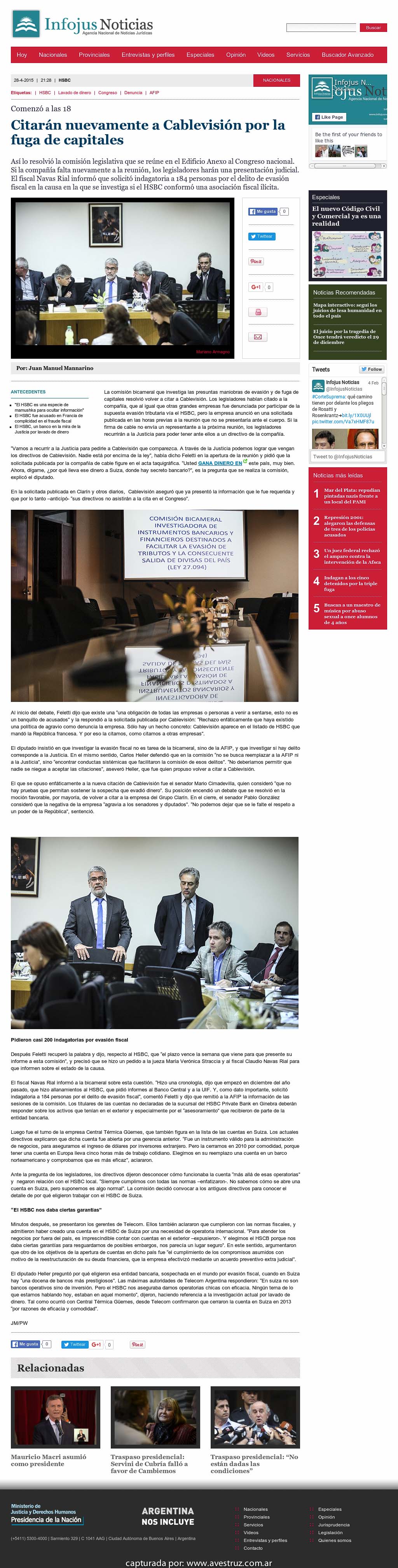 La comisión bicameral que investiga las presuntas maniobras de evasión y de fuga de capitales resolvió volver a citar a Cablevisión. Los legisladores habían citado a la compañía, que al igual que otras grandes empresas fue denunciada por participar de la supuesta evasión tributaria vía el HSBC, pero la empresa anunció en una solicitada publicada en las horas previas a la reunión que no se presentaría ante el cuerpo. Si la firma de cable no envía un representante a la próxima reunión, los legisladores recurrirán a la Justicia para poder tener ante ellos a un directivo de la compañía.