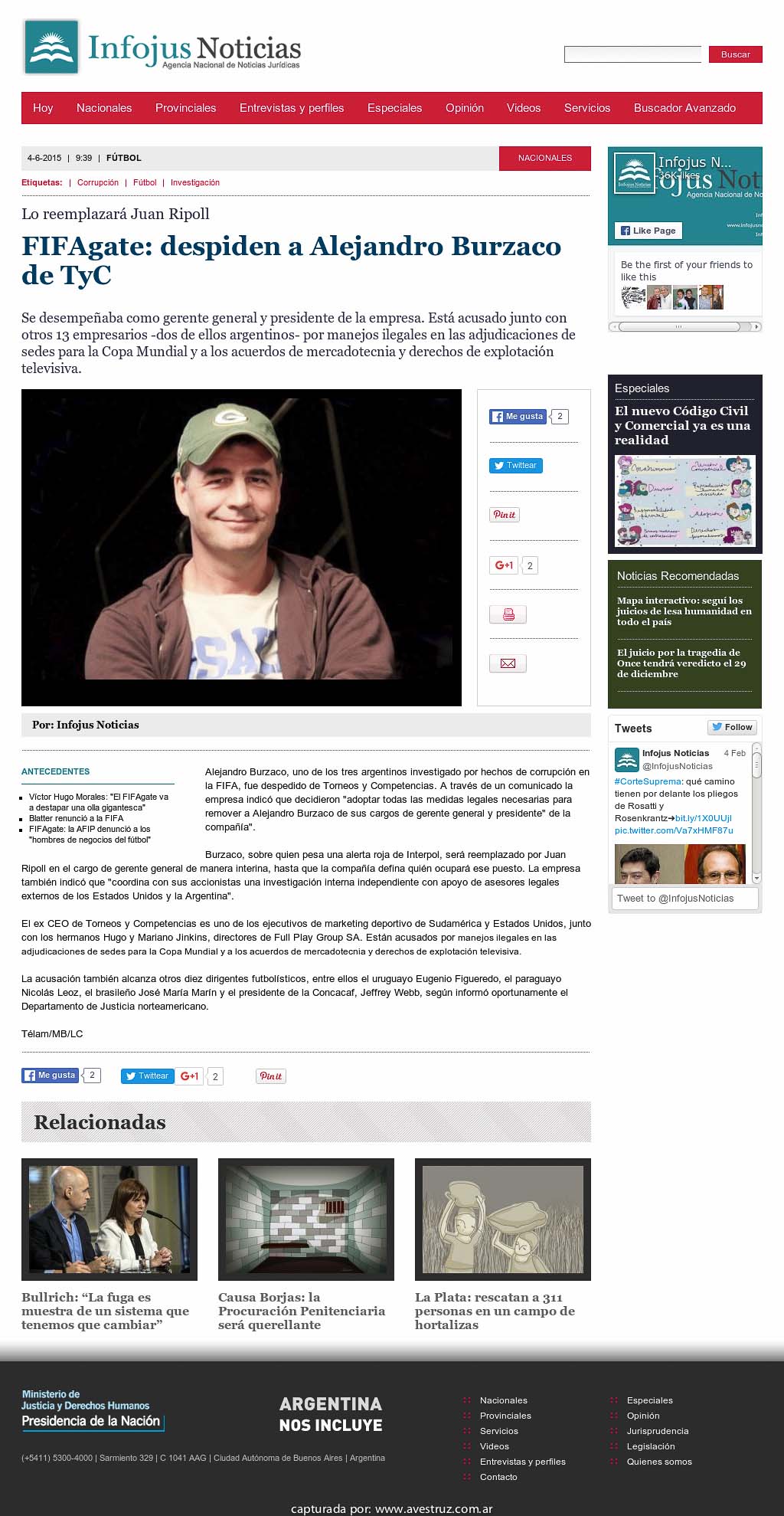 Alejandro Burzaco, uno de los tres argentinos investigado por hechos de corrupción en la FIFA, fue despedido de Torneos y Competencias. A través de un comunicado la empresa indicó que decidieron “adoptar todas las medidas legales necesarias para remover a Alejandro Burzaco de sus cargos de gerente general y presidente” de la compañía”.
