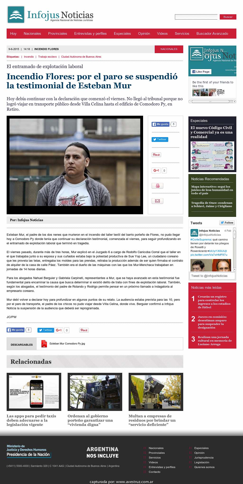 Esteban Mur, el padre de los dos nenes que murieron en el incendio del taller textil del barrio porteño de Flores, no pudo llegar hoy a Comodoro Py donde tenía que continuar su declaración testimonial, comenzada el viernes, para seguir profundizando en el entramado de explotación laboral que terminó en tragedia.