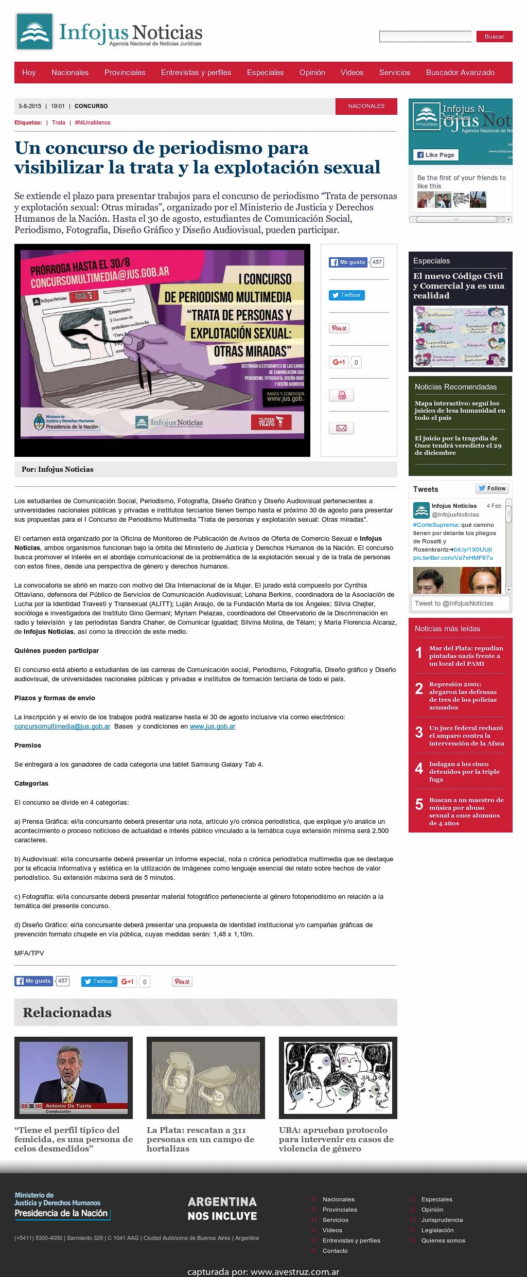 El certamen está organizado por la Oficina de Monitoreo de Publicación de Avisos de Oferta de Comercio Sexual e Infojus Noticias, ambos organismos funcionan bajo la órbita del Ministerio de Justicia y Derechos Humanos de la Nación. El concurso busca promover el interés en el abordaje comunicacional de la problemática de la explotación sexual y de la trata de personas con estos fines, desde una perspectiva de género y derechos humanos.